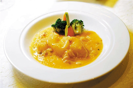 出自周师傅之手的龙虾汤鲜蟹肉烩花胶和翡翠金凤凰,同样充分尊重了食材原本口感。前者,本无大味的花胶加入龙虾汤后,不仅具有嚼劲,还带着龙虾特有的浓郁鲜甜味;蒸熟的蟹肉用生粉勾芡后,不仅去除了腥味,还锁住了螃蟹的鲜味。而后者,腌制后的去骨葵花鸡巻再用保鲜膜卷起来低温蒸,保鲜膜保留了鸡的鲜味以及姜葱的浓郁馨香。