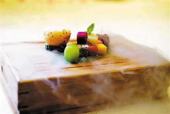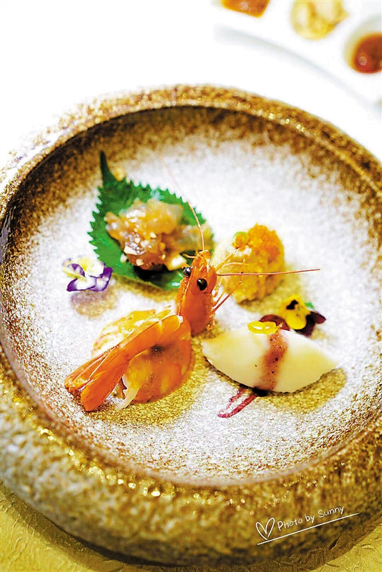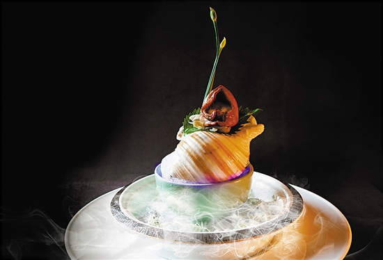 秉承着“吃得快乐”的创作初心,梁师傅为广州食客量身订制黑珍珠夏日菜单“宜夏”,包括初夏、仲夏、盛夏、宁夏、馥夏、季夏、消夏共八道珍馐美馔。其中代表仲夏的幻彩海蜇冷鲍鱼,打破鲍鱼热吃传统,是梁师傅的创意之作。干冰营造出烟雾缭绕的意境,甚是吸睛;冰镇带来沁凉口感的同时提升了鲍鱼的鲜味,选用金华火腿和不同肉类汤汁熬制而成的酱汁甘香浓郁。海蜇脆,鲍鱼糯,截然不同的口感叠加带来如梦似幻的层次感。
