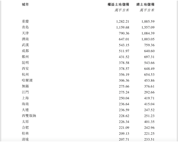 ▲融创部分城市土地储备概况。图片源自融创2019年半年报截图。