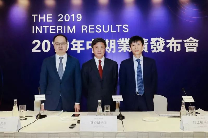 ▲中期业绩会现场,从左到右分别为融创副总裁兼董事会秘书高曦、融创董事局主席孙宏斌、融创行政总裁汪孟德。