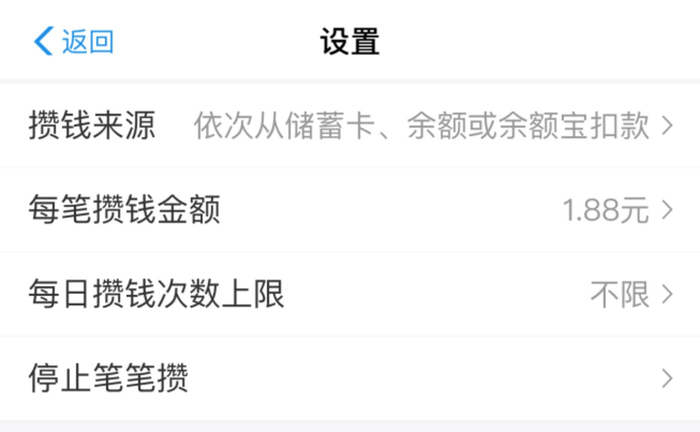 梳理完笔笔攒的设置与功能,其实已经能很清楚地给它下一个定义:以自动扣取的程序化方式,强制用户在每次消费时攒下一笔钱。