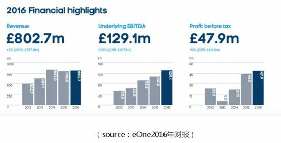 2016年,eOne年未扣除利息、税项、拆旧及摊销前盈利(EBITDA)为1.29亿英镑,同比2015年的1亿上涨20%;eOne2016财年税前利润4790万英镑,同比2015年的4400万英镑增长9%。