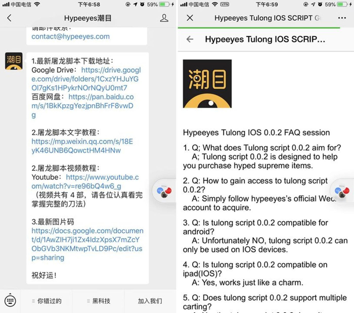 同期起步的还有主打潮流故事和资讯的新锐潮流媒体「Hypeeyes潮目」(下文简称“潮目”)。在潮目的公众号下方,除了有“潮目态度”、“潮目型录”、“潮目百科”、“潮目密探”四个内容板块,还有“倚天剑”、“屠龙”等黑科技板块,潮目在QA里解释,tulong是一款帮你抢购Supreme新品的工具。相比内容起家的潮流媒体,潮目的发展更多是技术驱动。