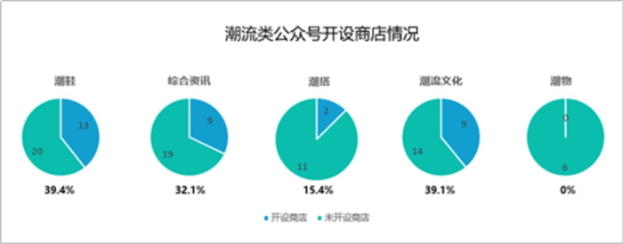 除了头部的潮流媒体,中腰部媒体也会选择电商作为一种变现模式。在新榜筛选的103个潮流公号中看到,多数账号也选择了电商作为其中一种变现方式,从数据上看,潮鞋类公众号开设商店最多,占比也最高。33个潮鞋公众号中有接近四成(13个)在公众号内开设有商店。