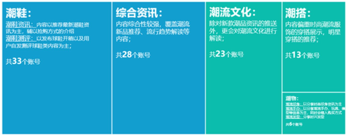 根据潮流类账号们发布的文章内容来分类,我们将103个潮流类账号大致分为五类:综合资讯、潮流文化、潮鞋、潮搭、潮物。