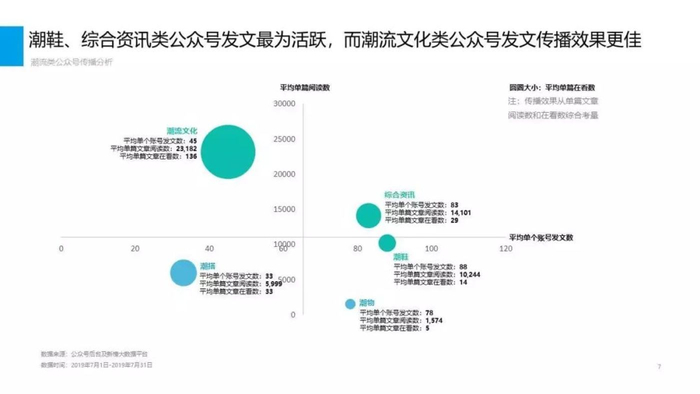 在我们挑选的103个潮流类账号七月份发布的所有文章中,阅读数达到10W+的文章共175篇,占比2.4%。并且,10W+文章主要由综合资讯、潮流文化以及潮鞋这三类公众号发出,其中,潮流文化类公众号生产爆文的能力最强,发出阅读数10W+的文章最多,达到69篇,占其当月发文数的6.7%。