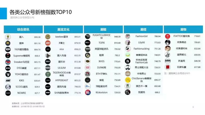 - 筛选标准:本文对潮流类公众号选取范围如下:以潮流、潮牌、球鞋、球鞋潮流、潮牌、潮品、潮人、潮圈、潮女、潮男、先锋时尚、配饰、穿搭,共计13个潮流相关关键词在新榜数据库中,提取公众号名称、认证信息以及标签3个字段中出现上述关键词的公众号,并从中选取7月新榜指数≥600的账号,总计1218个再通过账号内容及调性,对上述账号进行判断(排除纯时尚穿搭或种草类账号),继而最终得出103个符合潮流定义的公众号。