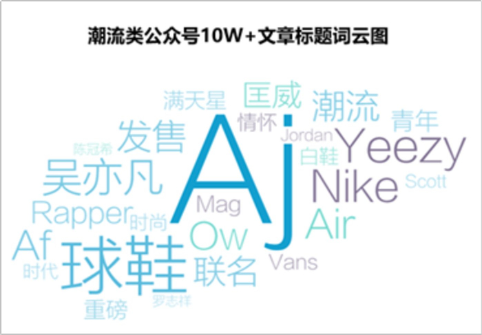 再深入看这些阅读量10W+的文章,我们发现,在10W+文章的标题中,出现最为频繁的字眼总是与鞋有关,比如AJ、Yeezy、Nike、球鞋、白鞋等。谈到“潮”,潮鞋总是绕也绕不开的话题,并且潮鞋相关的字眼也总是能第一时间抓住读者的眼球。