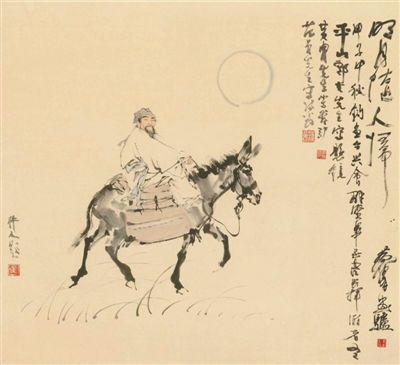 1984年夏,时任日中文化交流协会副会长的平山郁夫访华,与一些中国著名画家齐聚一堂,大家不禁乘兴挥毫。宣纸一铺,黄胄说:“小范,你先画一个人。”范曾素以作画神速著称,二三分钟,一位闭目吟哦的诗翁已跃然纸上。说时迟那时快,黄胄在诗翁下添了一头生动至极的毛驴,取“诗思在驴背上”之意。接着,平山郁夫悬笔在天空勾起一轮满月。十分钟不到画成,众皆称佳。大家共邀吴作人题字,文云:“明月随人归,甲子中秋钓鱼台兴会,群贤毕至,尽兴挥洒者有平山郁夫写悬镜,黄胄先生写奔驴,范曾先生写诗翁。”《明月随人归》(见上图,资料图片)成为一幅不朽之作,记载了中日绘画大师的友情,珍藏在钓鱼台国宾馆。