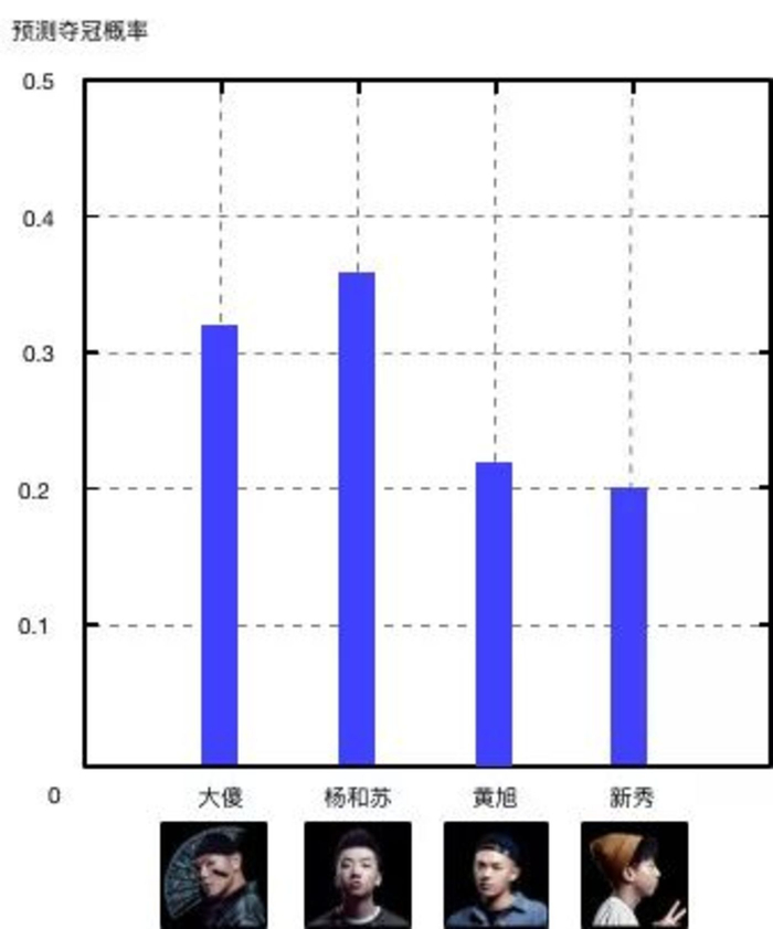 从这次的结果可以看出来,杨和苏与黄旭的夺冠概率增加了许多;如果用本届新说唱全国9强选手的数据放入模型计算的话,能够进入四强的选手是杨和苏、黄旭、大傻与新秀,这个结果还是比较符合现实结果的。