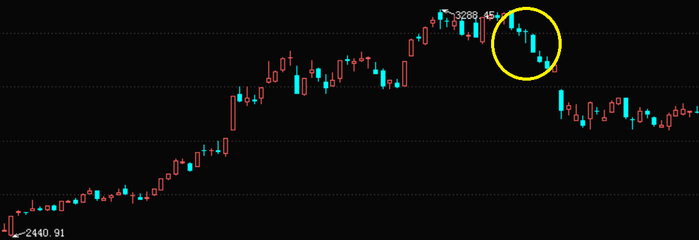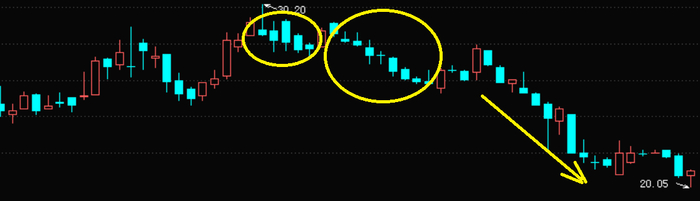 个股如果经历一波上涨后,在高位出现连阴走势,如果后期不能扭转,之后便会出现加速下跌。