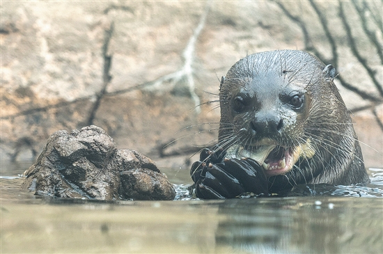 匈牙利布达佩斯动物园,一只大水獭在吃鱼(新华社发)