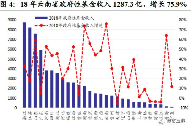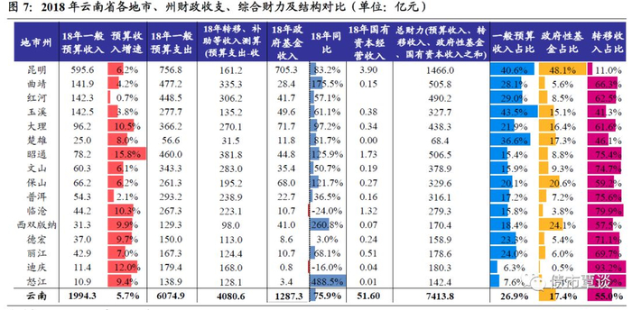 从地方综合财力和来源结构看,(1)省会昆明市综合财力位列云南省第一,地方综合财力测算值为1466亿,远超省内其他地市州,占云南省19.8%,其次为昭通市、曲靖市,综合财力在500亿左右,而楚雄州最低不足100亿;②以土地出让收入为主的政府性基金收入在2018年增长迅猛,全省总量增长75.9%,西双版纳、怒江、曲靖增速在150%以上,昆明、保山、西双版纳政府基金收入超越一般预算收入;③从地方综合财力来源结构看,昆明、玉溪财政自给率最高,一般预算收入占比分别40.6%和43.5%,而迪庆、怒江州最低不足8%;昆明市还对土地出让收入依赖性较高,政府性基金收入占比最高,达48.1%;其余地市更多依赖上级补贴、转移支付和发地方债等,转移收入占地方综合财力比重多数在50%以上,有6个地级市州占比甚至在75%以上。