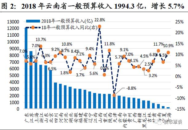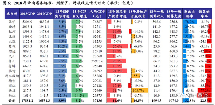 红河州位于云南省南部,下辖4市9县,是国家一带一路”建设重要节点和中国陆路通往东盟的重要通道,18年末常住人口474.4万人,少数民族占比61.2%。矿产资源丰富,锡储量居全国之首,也拥有全国最大的锰生产基地。红河州现重点发展高原特色现代农业、新材料和信息产业、生物医药和大健康产业、食品与消费品制造业、现代物流业6大产业,传统烟草、冶金、能源、化工、建材等产业也不断转型升级。2018年GDP为1593.77亿,增长9.7%,居全省第3,固定资产投资增长16.9%;一般预算收入142.3亿元,增长0.7%,税收占比59%;政府性基金收入41.74亿,增长57.1%;预算支出448.49亿元,增长11.3%,财政自给率为32%。