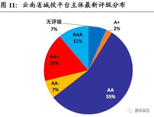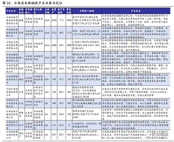 云南省本级城投发债平台有11家,其中AAA级5家,AA+级2家,AA级4家,其中,云南省城市建设投资集团(基建)为云南省基础设施建设运营主体,对省政府授权的城建项目行使出资人职能,旗下子公司云南水务(水投)为云南省水务资产经营和项目建设投融资主体,另一子公司云南城投置业股份有限公司(房地产)则为云南城投集团旗下负责房地产板块;云南省投资控股集团(投控)为云南省下属最大的综合性投资主体,参控股云南能投、云南铁投等关系云南省经济命脉的大企业;云南省交投集团(交投)为云南省最重要的高速公路投融资建设和运营主体;云南省建设投资控股集团(原云南建工集团),为云南省内大型龙头建筑企业,以及省级棚户区改造投融资建设主体,其子公司云南省城乡建设投资有限公司(保障房),为云南省唯一的省级保障房建设以及棚改投融资主体,专营优势突出。云南省水利水电投资有限公司(水利)是云南省水利工程项目建设开发和运营的重要主体;云南省能源投资集团(能投)为云南省能投主体,代表省参与能源开发、建设、投融资的主体,电力业务占比90%以上,核心子公司云南省电力投资公司(电力),为云能投集团旗下电力板块重要投资和运营主体;此外,还有云南省铁路投资有限公司(铁路投资),为云南铁路基建主体,并从事贸易、物流等多元化经营。
