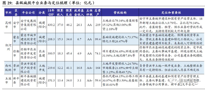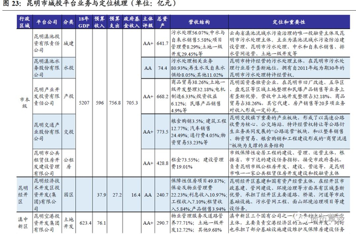 云南省本级、地市州、区县37家城投平台梳理。我们对各市州级、市区级平台进行分类和梳理,以把握各市州平台数量、排序、业务和专营区域范围,以利于筛选核心城投平台。