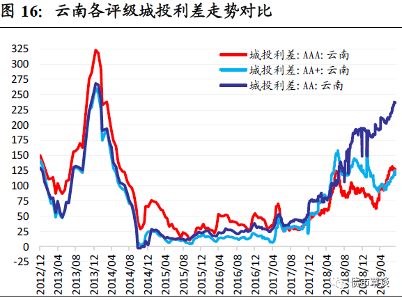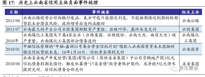 云南省区域利差居高不下,除财力偏弱和债务率较高因素外,历史上云南省信用主体多次发生信用负面事件也是原因之一。我们梳理了2011年以来云南地区发生过的信用负面事件,无论是2011年的滇公路、云投集团,还是2018年云南国资、省房集团事件等,皆呈现出主体政府级别高(省级)、资产规模大、产业资产比例高的特征,导致信用负面事件冲击影响大,市场对这一区域投资偏好普遍持谨慎态度。
