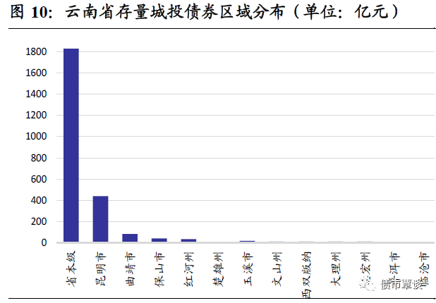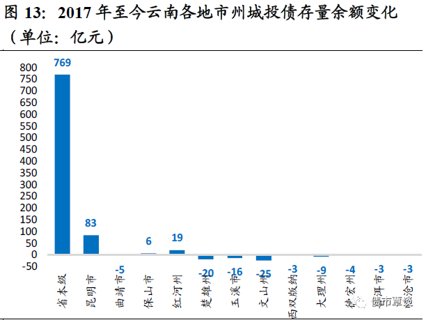从2017年至今发债净融资量看,省本级和昆明市与其他地市呈现明显分化趋势,云南省城投债券余额2017-19年净增长786亿,其中,省本级、昆明市、红河州城投债券余额近2年呈现净增长,存量债券余额分别增加769亿、83亿和19亿,而其余各地市则整体以净下降为主,存量债券余额在15亿以下的地级市(州)数量有8个,还有4个市州不发债。