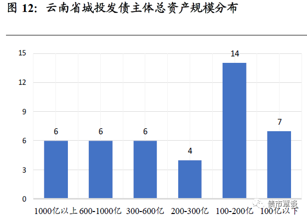 从全省整体城投平台总规模来看,云南省大部分城投平台规模较小,大部分资产总额位于200亿以下。1000亿以上的仅有5家,占比为13.51%;500亿-1000亿的有6家,占比为16.22%。规模在500亿以下的占比为70.27%,其中规模在200-500亿之间的共有9家,100-200亿之间的有11家,100亿以下的有6家。