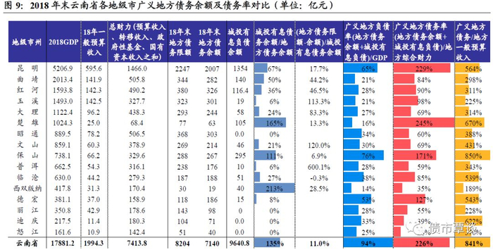 从各地市地方债务率水平来看,①以“地方债务余额/GDP”衡量的地方负债率中,德宏州、昆明市、保山市、昭通市、迪庆州债务率水平最高,均在30%以上,西双版纳、楚雄州最低不到7%;②以“地方债务余额/地方综合财力”衡量的地方债务率,全省总量占比为96%,其中昆明市最高为137%,德宏州、玉溪市、楚雄州也相对较高,均超过90%,而西双版纳、迪庆州、怒江州这一比例较低,均不到40%;③如果仅以“地方债务余额/地方一般预算收入”这一最狭义口径来看,则迪庆州、德宏州这一比例最高均超过500%。