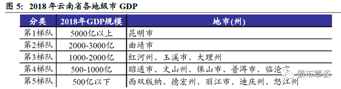 从经济总量来看,如果把云南省16个市州分为5个梯队,则昆明市属于第1梯队(GDP在5000亿以上),18年GDP达5206.9亿,占云南省经济总量的29%;第2梯队(GDP在2000-3000亿)市州有1个,为曲靖市;第3梯队GDP在1000-2000亿区间,包括红河州、玉溪市和大理州;第4梯队GDP在500-1000亿区间,包括昭通市、文山州、保山市、普洱市和临沧市;而西双版纳、德宏州、丽江市、迪庆州和怒江州GDP在500亿以下,经济总量偏弱,处于第5梯队。