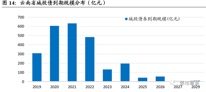 从城投债到期分布来看,2020-2022年为到期高峰期,到期规模分别为606亿、634亿和485亿,2022年以后到期量下降至200亿以下。