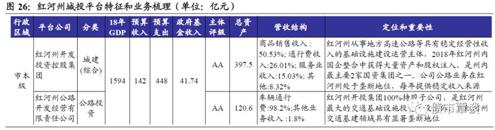 州本级核心城投平台为红河州开发投资控股集团,为红河州从事地方高速公路等具有稳定经营性收入的基础设施建设运营主体,18年在国企整合中获大量资产和股权注入;子公司红河州公路开发经营有限公司,是红河州最大的交通基础设施投资建设主体,经营3条收费公路。