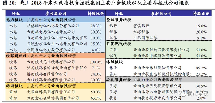 云南省投资控股集团,为云南省下属最大的综合性投资主体,参股、控股的云南能投、云南铁投、云南医投、云南旅投、云南石化燃气公司、富滇银行、红塔证券、云南扶贫投资开发公司等,均为关系云南省经济命脉和民生的大企业,在云南省经济中具有重要战略地位。2014-18年5年间累计获得政府注资126.62亿,获累计补助28.53亿。截止19年3月,获银行授信2405.89亿,未使用1185.98亿,财务弹性强;受限资产77.38亿;对外担保80.18亿,担保率8.17%,被担保企业主要有云南国资运营公司和云天化集团。