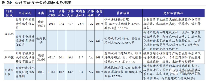 曲靖市本级城投发债平台有2家,核心平台为曲靖市开发投资有限责任公司,负责曲靖市主城区基础设施建设和公用事业运营,承担城市基建、保障房、供水等业务。截止18年末,基建在建项目总投资69.64亿,尚需投资49.75亿,面临一定资金压力;存量土地资产账面价值36.96亿,近2年无土地销售收入;18年保障房项目已基本完工,但尚未收到回购资金,后续资金回流情况仍需关注。截止18年末,公司受限资产7.1亿,占资产比4.33%;对外担保40.26亿,担保率34.26%;获银行授信36.21亿,未使用11.9亿。