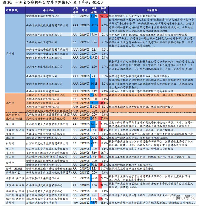 我们根据各城投平台最新评级报告等梳理了云南省各地市级平台担保情况,总体上云南城投平台担保比率不高,面临的或有担保风险相对可控,总结情况如下表所示: