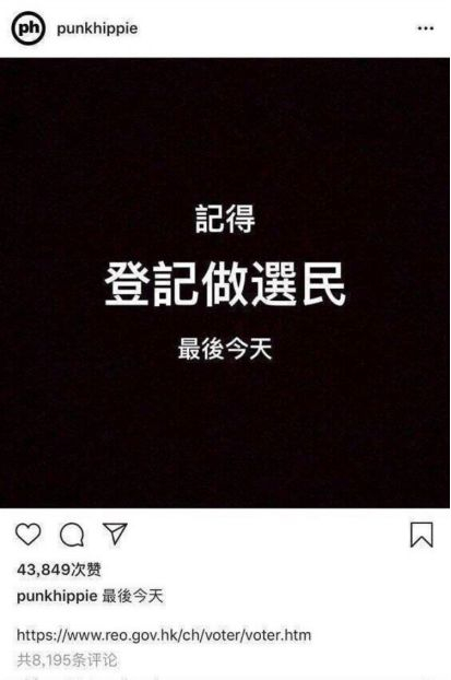 爆料还称,他曾于今年7月初在Instagram上发文:“记得登记做选民,最后今天”。网友提到,这被认为是香港反对派喜欢采用的“黑底白字”风格,以此彰显 “不同”。↓