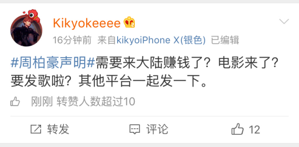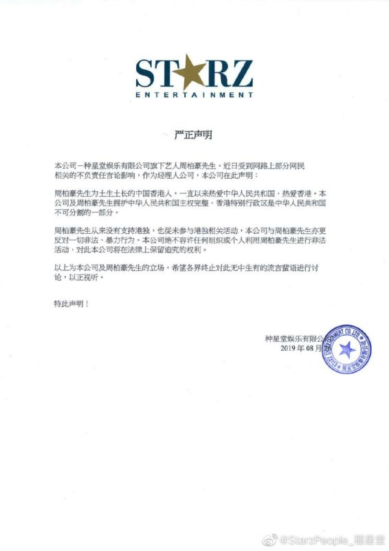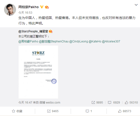周柏豪还转发其签约公司的声明全文↓