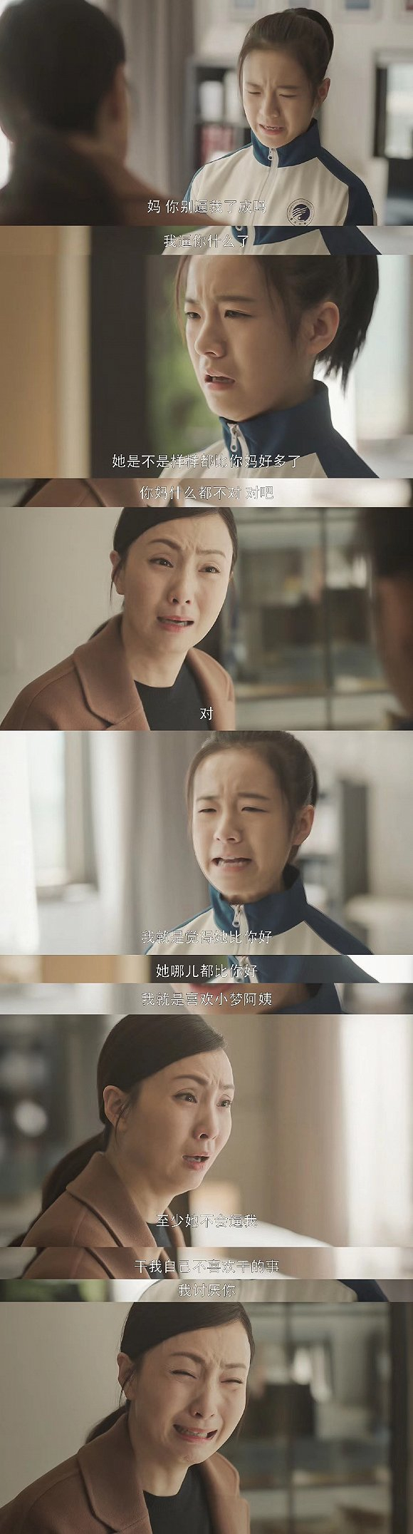 陶虹:生活都是即兴的,但是表演的话你得在一场戏中完成既定任务,比如这场戏的结果就是要闹到极致,最后我失控地打了英子一嘴巴,她失控地说了一些从来没有说过的过分的话。这个在争吵中经常会发生,人在生气、愤怒的时候,智商都是零,啥乱七八糟混话都能说得出来,什么解气说什么。因为这个妈妈在这一刻受伤受的太严重了,她看到自己的女儿跟别人去其乐融融了,自己像一个局外人,那种极端的绝望感导致她的行为过激,推倒了乐高,十几岁的孩子受到那个刺激以后,其实是极度恐慌的,再加上她妈妈一而再拿话逼她,孩子就口无遮拦了,这些因果关系最后造成了能伸手垫得起来的一个状态。我们老说“有台阶有肩膀”,你掂起来我才能打下这个巴掌。