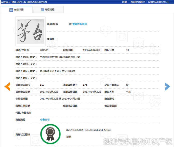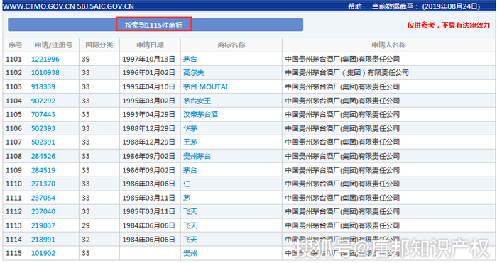 中国商标网数据显示,截至目前,贵州茅台共申请注册了1115件商标,包括“茅台”、“MAOTAIZHEN”、“贵州茅台”、“茅台MOU TAI”、“茅台;KWEICHOW MOUTAI”等商标,且大部分已注册成功。