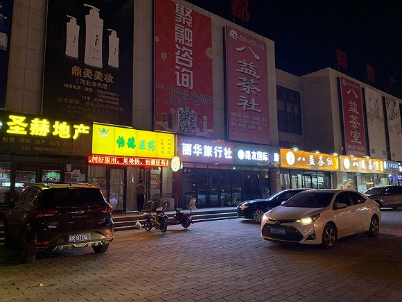 胜芳镇夜景,一条有旅行社门店的街道和周围的生意。 拍摄:郑萃颖