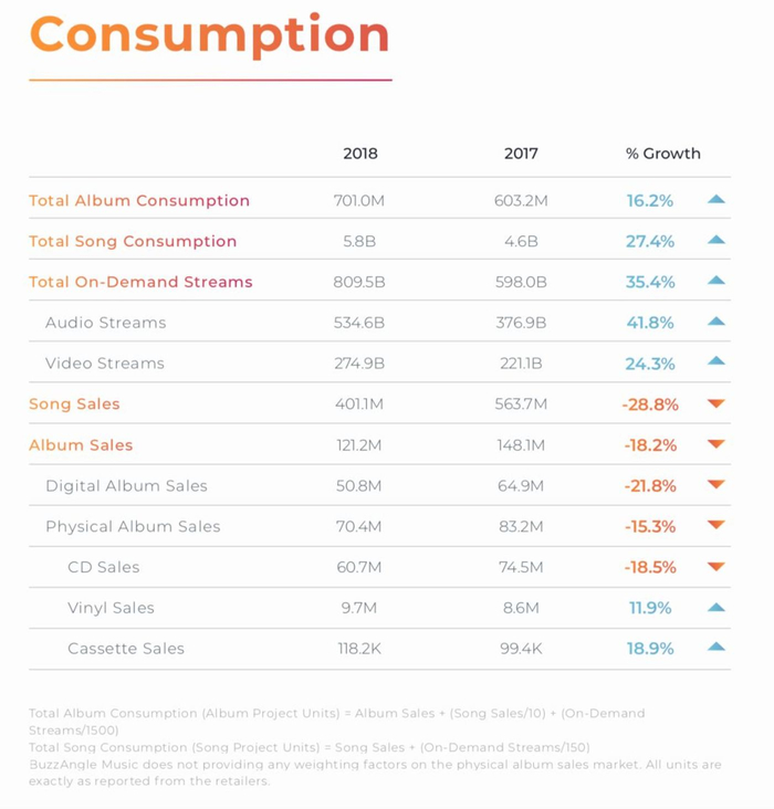 再来看美国市场。根据BuzzAngle的数据,2018年美国黑胶和磁带的销量分别上涨了11.9%、18.9%,但这两者的上涨无法掩盖实体总销售量下滑的事实。2018年,美国实体专辑市场整体下滑15.3%,CD、黑胶、磁带合计共7040万张,在当年含流媒体播放折算的整体专辑(7.01亿张)消费中比重仅1%。