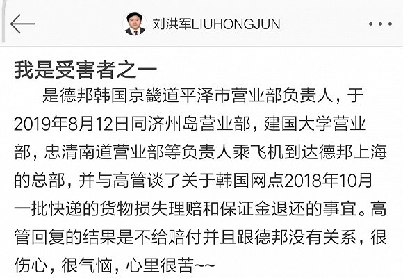 近日频频因为运输理赔问题引发热议的德邦快递,又遭到了一位韩国网点代理商的“控诉”。