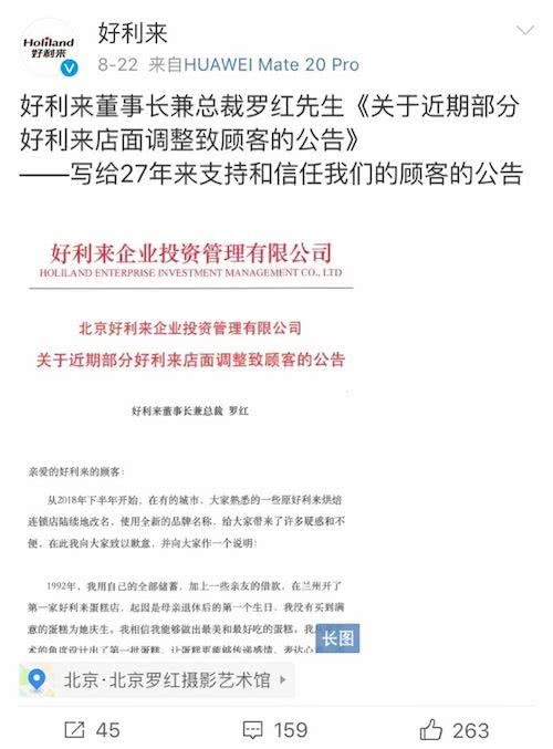 这一系列更名的谜底在8月22日揭晓,好利来董事长罗红通过官方微博和微信公众号发布公告:好利来更名是因为联合创始人内部加盟机制的解除,负责不同片区的联合创始人自立门户,自建品牌。