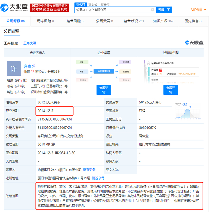 天眼查数据显示,铂爵旅拍的运营主体为铂爵旅拍文化有限公司,成立于2014年12月31日,创始人、法定代表人、最终受益人为许春盛,经营范围包括摄影扩印服务、文化、艺术活动策划、专业化设计服务等,共拥有22家企业的实际控制权。