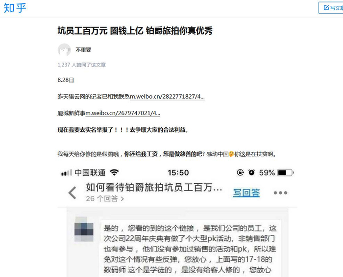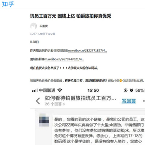 值得一提的是,在网友发布该维权贴后,多位声称是铂爵旅拍的员工在知乎、微博平台留言表示遇到了同样的遭遇。而还有网友上传视频显示为“铂爵旅拍要求员工拉亲友刷业绩”。