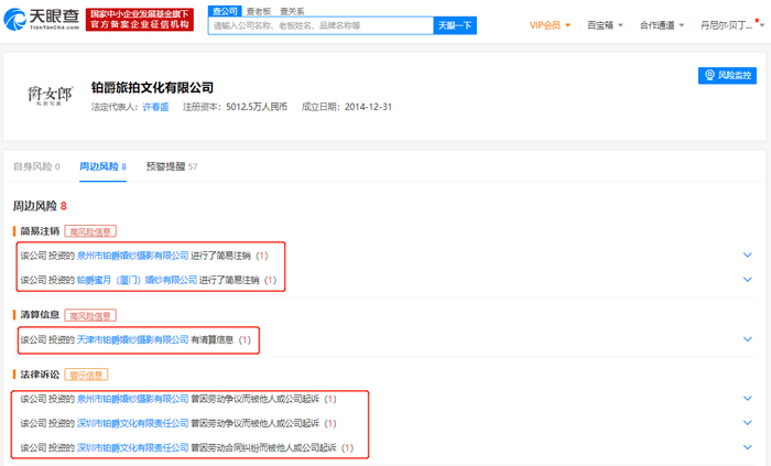 其中,其全资控股企业泉州市铂爵婚纱摄影有限公司曾因劳动争议而被他人或公司起诉,全资控股企业深圳市铂爵文化有限责任公司则曾因劳动争议、劳动合同纠纷而被他人或公司起诉。此外,铂爵旅拍数家子企业进行了简易注销或清算。(中新经纬APP)