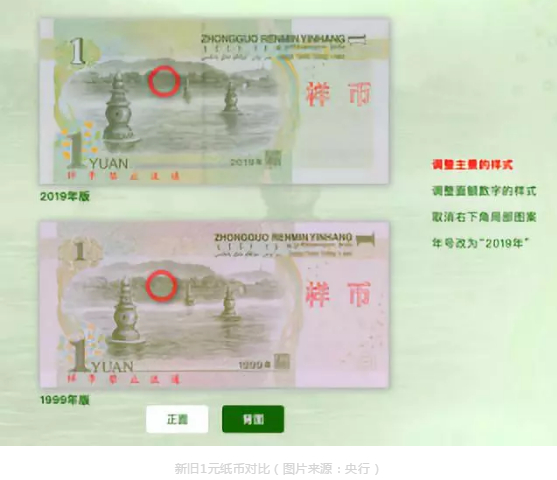 人民银行表示,现行第五套人民币纸币(2005年版50元、20元、10元纸币,1999年版1元纸币)、硬币(1999年版1元、5角硬币,2005年版1角硬币)相比,2019年版第五套人民币的防伪技术和印制质量在多个方面进行了提升。