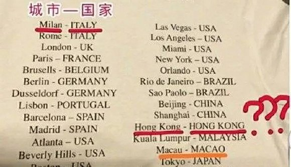 8 月 11 号,一张 Versace T恤的图片在微博上引发热议。有用户发现在 T 恤后背印有的图案中,将中国香港和澳门列为国家分类,涉嫌损害中国国家主权和领土完整。