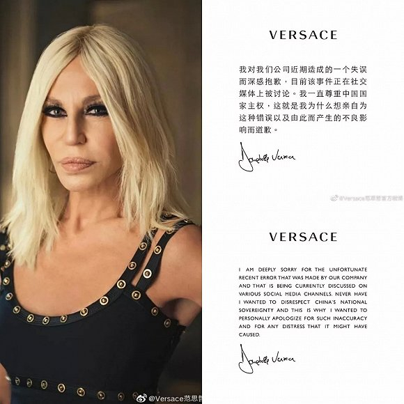 接着,Versace 深夜道歉并发表申明:“我们热爱中国,坚决地尊重中国国家领土主权”。对此网友回应,希望品牌海外社交平台同样发布道歉声明。当天下午,品牌方在海外社交媒体平台 Instagram,Twitter 和 Facebook 上相继发表了道歉声明,并附上了品牌继承人暨创意总监 Donatella Versace 的签名。