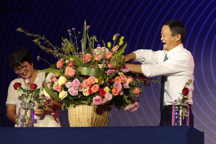 马云在女性创业者大会挑战插花技能
