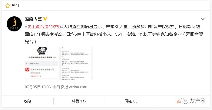 据某工商网监测信息显示,未来30天里,拼多多因知识产权保护、售假等问题面临171项法律诉讼,日均6件!原告包括小米、361、安踏、九牧王等多家知名企业