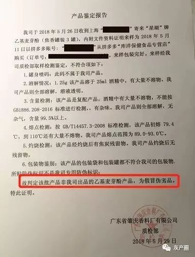 但是孙女士可不是一般人,她不辞辛劳,辗转将麦芽酚送到了该品牌的厂家检验部门。鉴定结果出来,该麦芽酚质量检测严重不过关,包装的防伪标识也不是专用的防伪标识。因此,3罐麦芽酚是假冒伪劣品。