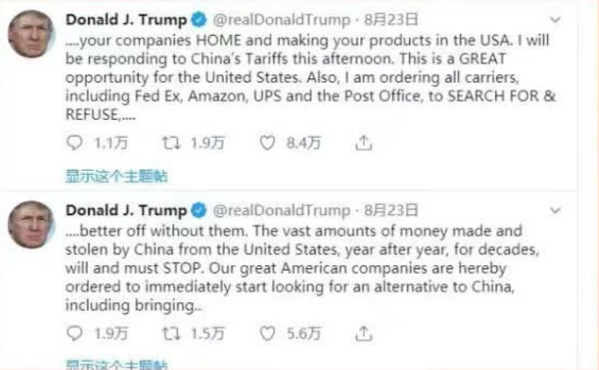 其实,就在大家热火朝天在Costco“抢货”的仅仅前五天,上周五(8月23日),美国总统特朗普发推特称,“我命令我们伟大的美国公司立即开始寻找在华经营的替代方案,包括将业务转移回美国,在美国境内生产商品。这会是美国的伟大机遇……”