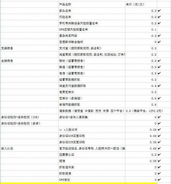 下面是一位系统商提供给界面新闻记者的可借调信息名单,表格里打钩的是建议勾选的项目。可以看到,将建议勾选的项目加起来,借调一次数据的成本也只有2.5元到3元。对比动辄上百元的获客成本,超利贷平台对风控的不重视可见一斑。