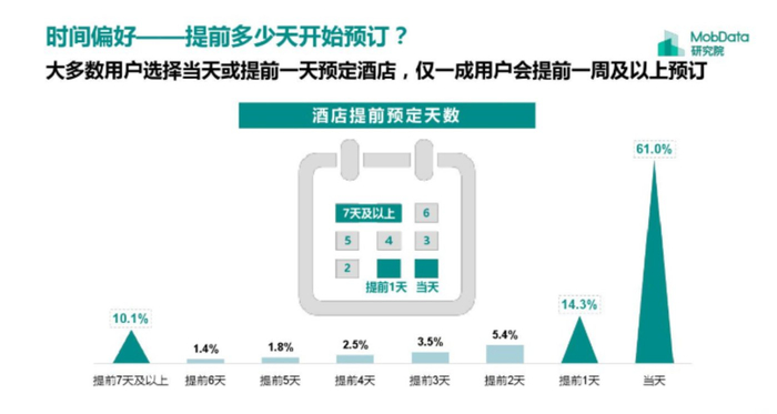 其次,需求与价格同向变动的另一个重要因素是市场对商品的涨跌预期,而预期产生的前提,是购买行为不具备时效性,消费者可以被延迟满足。但根据MobData研究院的调研数据,高达75%酒店住客都是选择当天或提前一天预定酒店,可见价格预期在住宿市场消费决策中起到的作用相当有限。